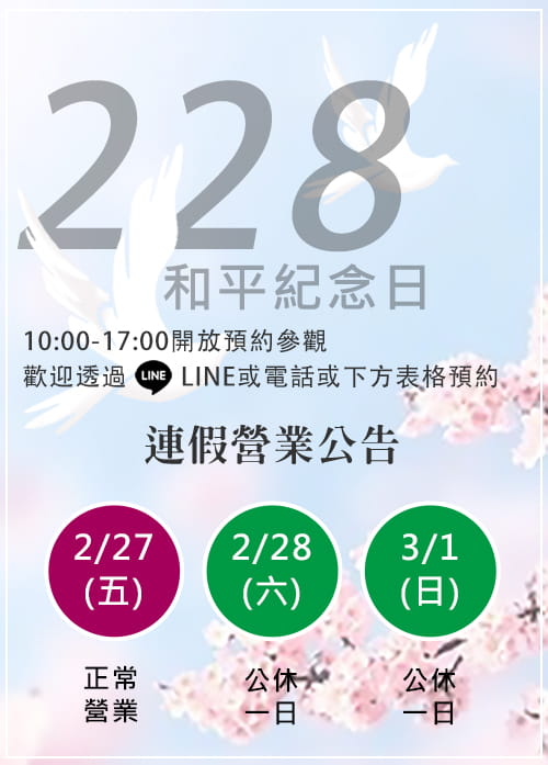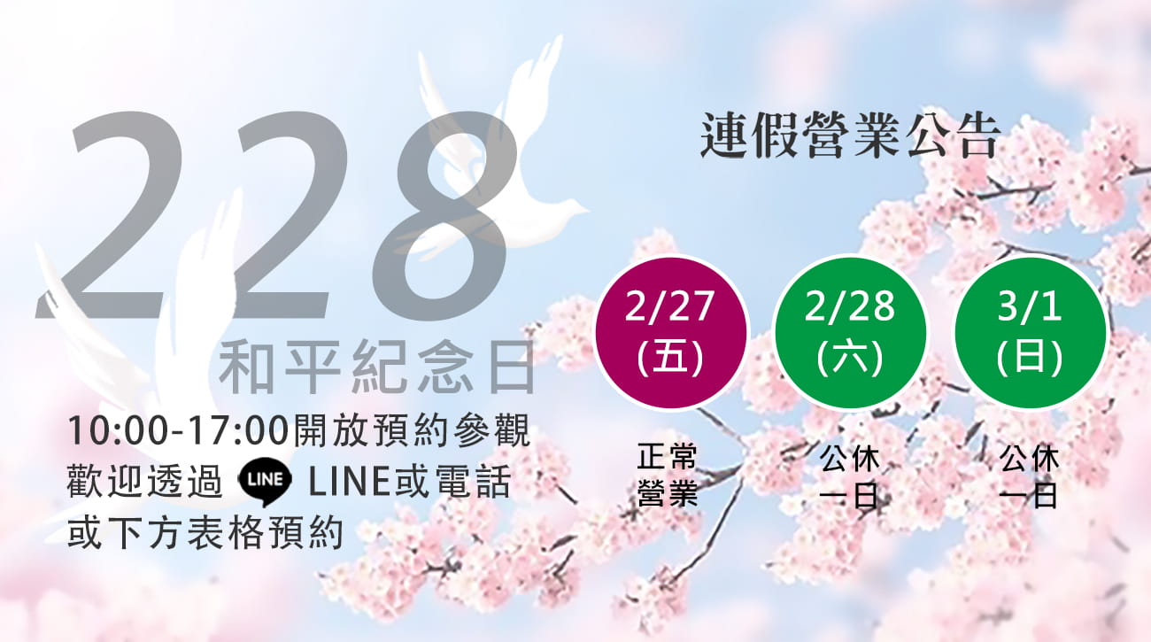 【228連假營業公告】:2/27(五)營業時間10-17點,2/28(六)公休一日。