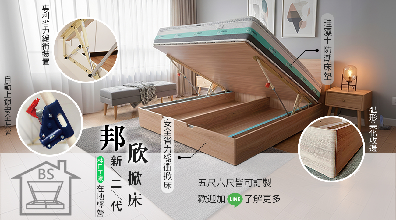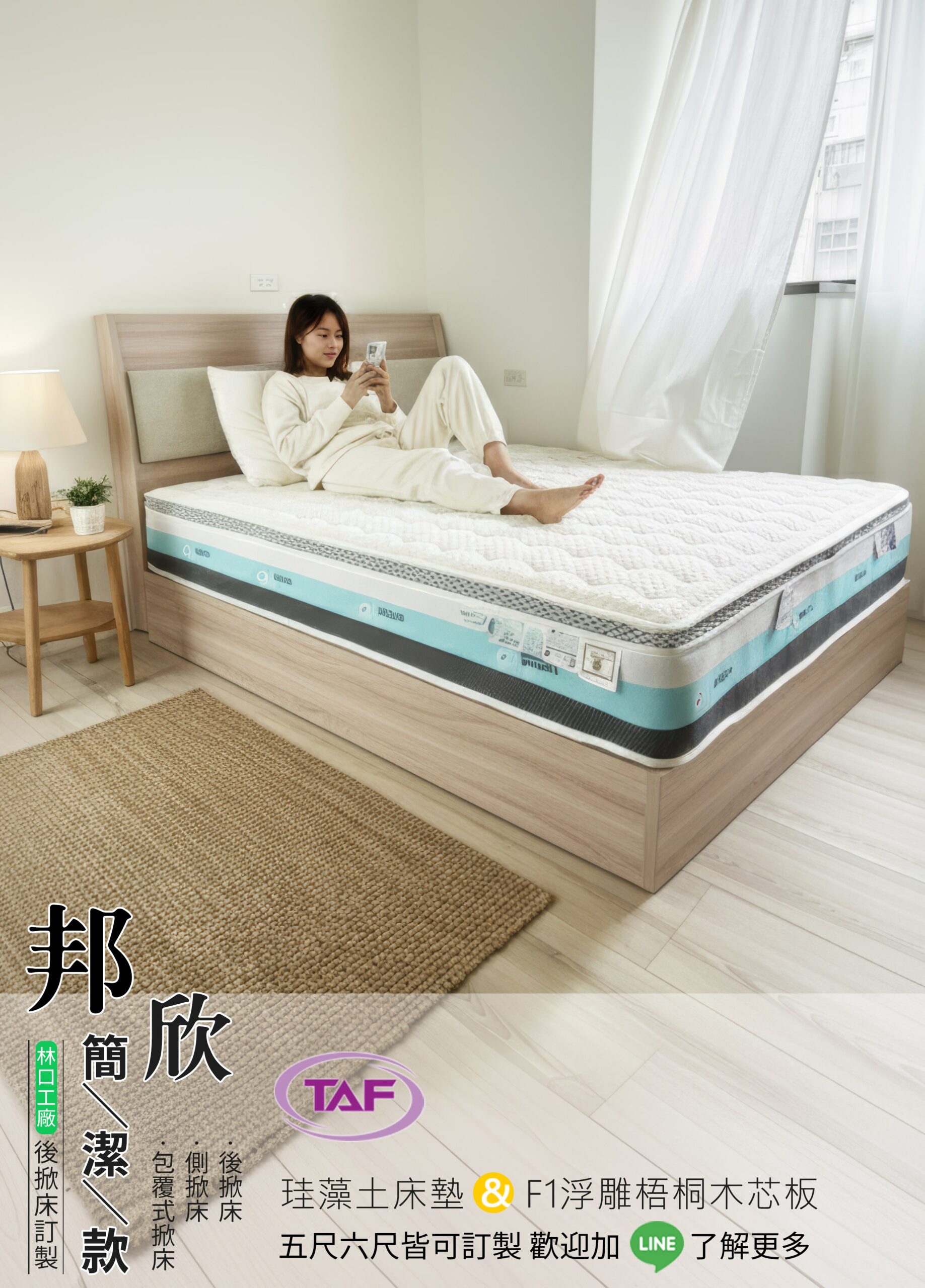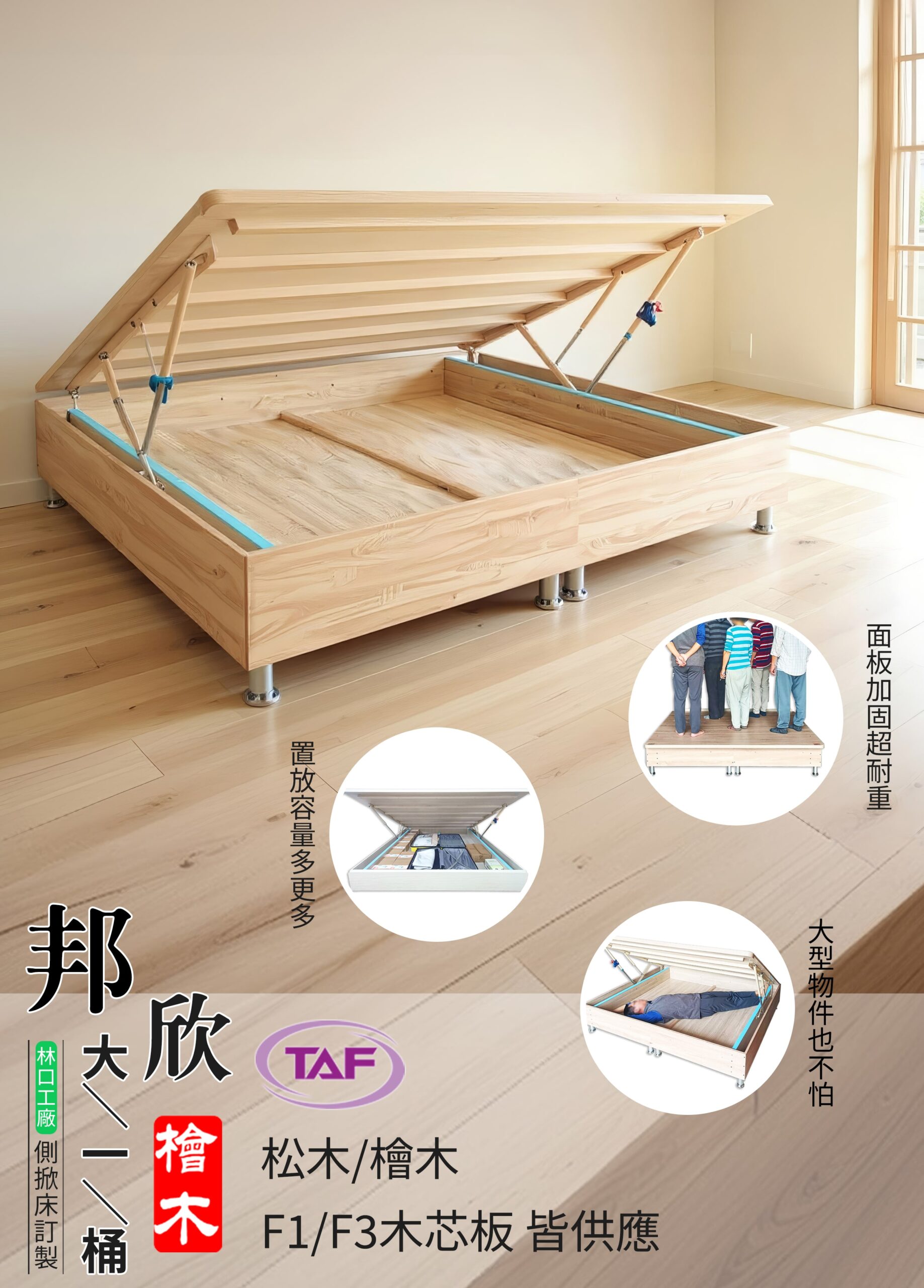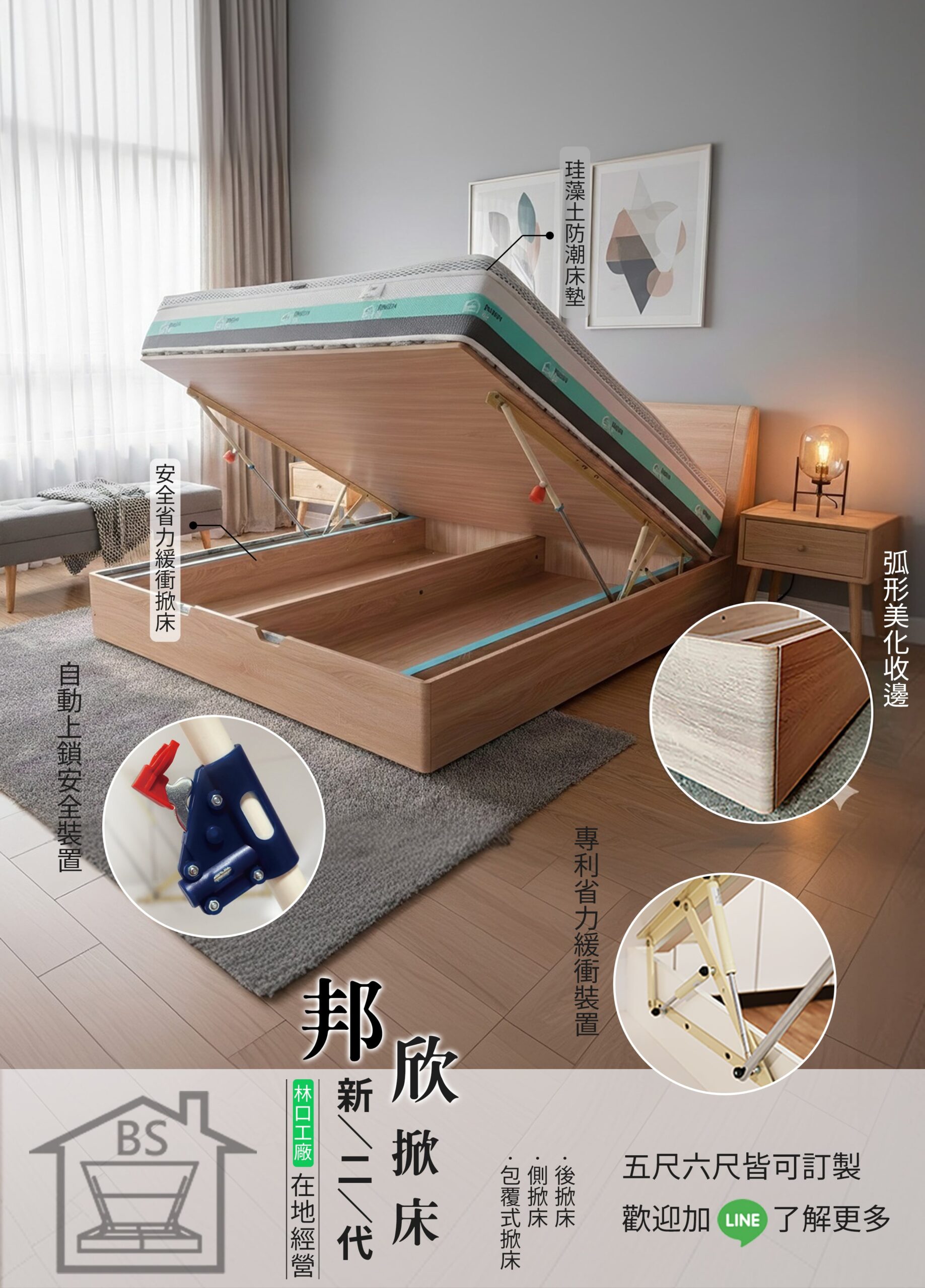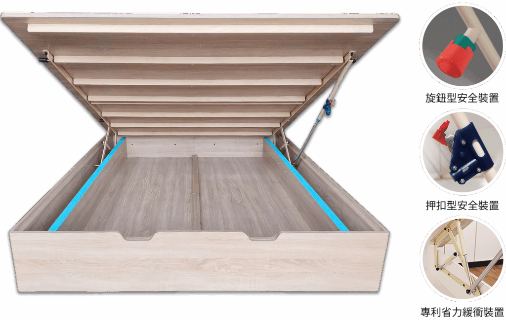 1.安全省力緩衝掀床標準雙人5×6.2尺F1木心板-浮雕天然白橡色。