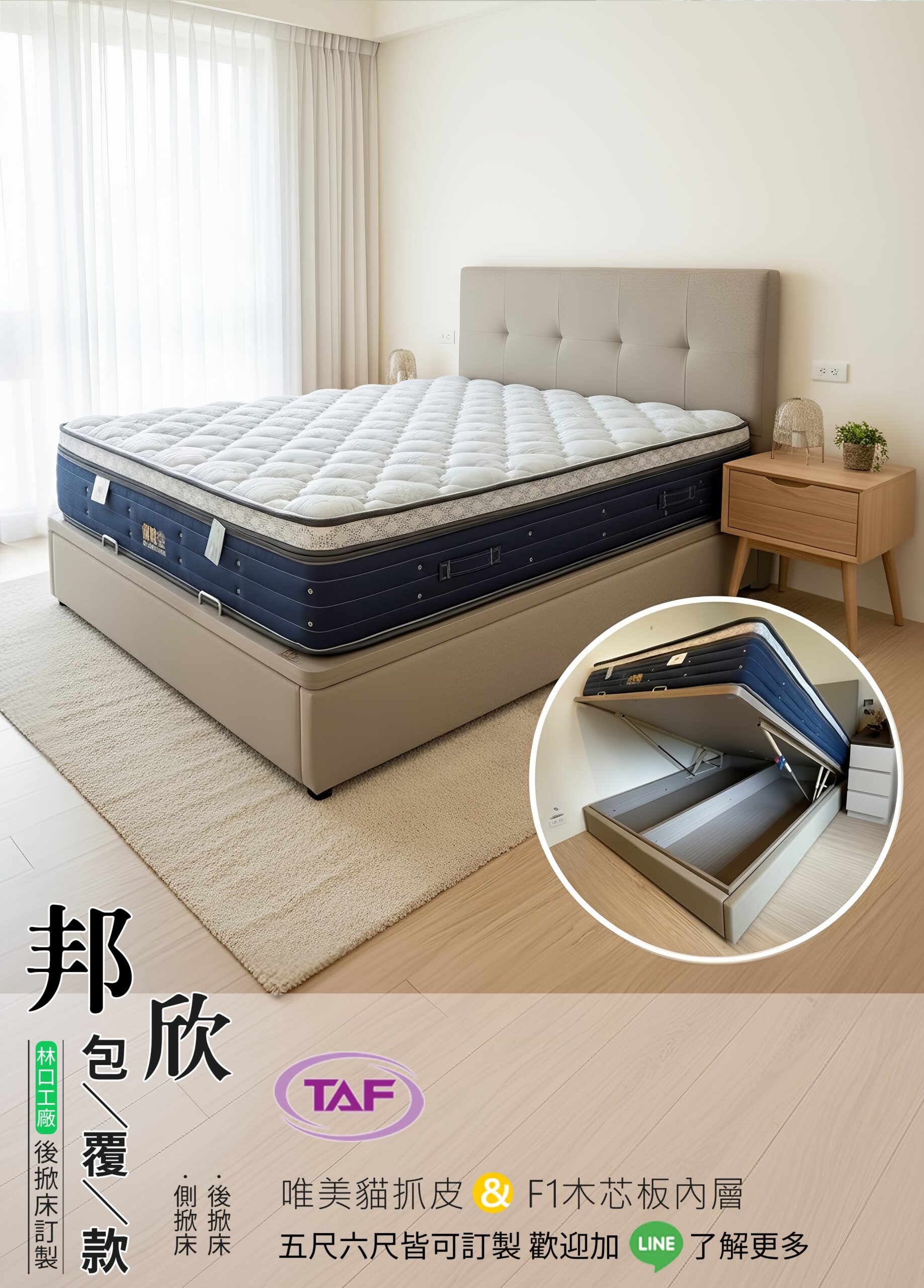 1.安全省力緩衝掀床標準雙人5×6.2尺包覆式切齊款-貓抓皮5號色/浮雕秋香色。